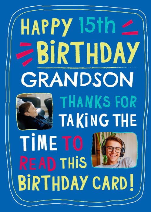 Front of card: Featuring bold vibrant typography on a blue background. Text reads: "Happy 15th birthday grandson thanks for taking the time to read this birthday card!". '15th' and 'grandson' can be personalised!