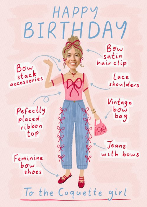 This feminine birthday card features a hand-drawn coquette-inspired outfit with playful annotations highlighting bows, lace, and vintage details. A soft pink background adds a whimsical touch. The circular photo cutout personalises the character’s face, while the text celebrates the recipient’s elegant style.