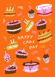 Featuring playful illustrated smiling cakes, cupcakes, and candles on a bright orange background with white hand-lettered typography in the centre.