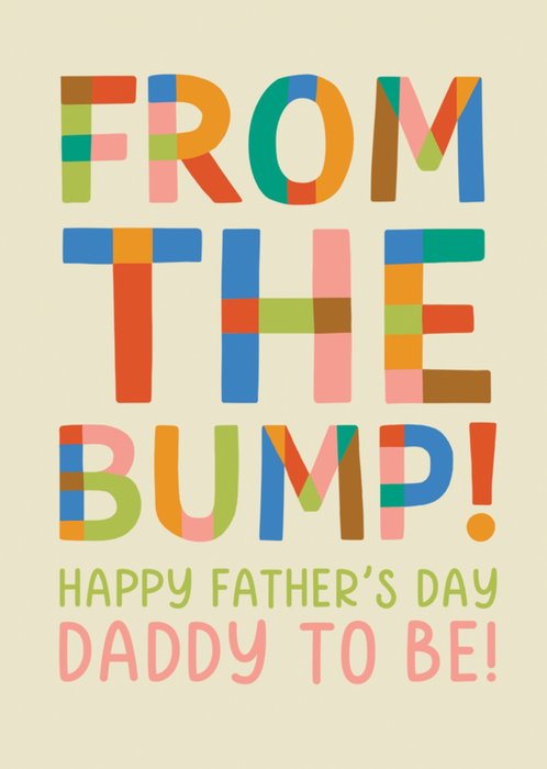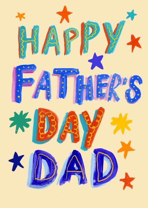 A bright and celebratory Father's Day card featuring bold, hand-painted lettering in a variety of colours and styles that read “Happy Father’s Day Dad”. Scattered multicoloured stars surround the playful text, all set against a soft cream background, giving the card a festive and joyful feel.
