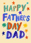 A bright and celebratory Father's Day card featuring bold, hand-painted lettering in a variety of colours and styles that read “Happy Father’s Day Dad”. Scattered multicoloured stars surround the playful text, all set against a soft cream background, giving the card a festive and joyful feel.