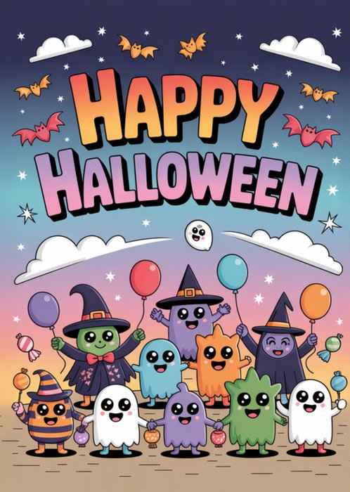 A modern design featuring cute ghost and witch characters holding balloons under a central message. The design has a dark blue and pink background with scattered bat, cloud and star icons.