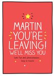 Happy Jackson Simple, typographic design on a red background. The editable part of the caption is the recipient's name, followed by the non editable You're Leaving We'll Miss You. Have Fun And Please Stay In Touch.