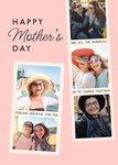 Featuring a Mother’s Day greeting card with four polaroid-style photo frames in a vertical collage on a pale pink background, with large lettering on the left.
