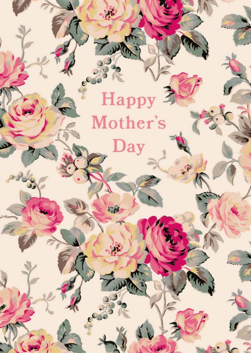 This Cath Kidston greeting card features a vintage floral design with soft pink, yellow, and cream roses, along with delicate green foliage on a warm beige background, creating a timeless and elegant look.