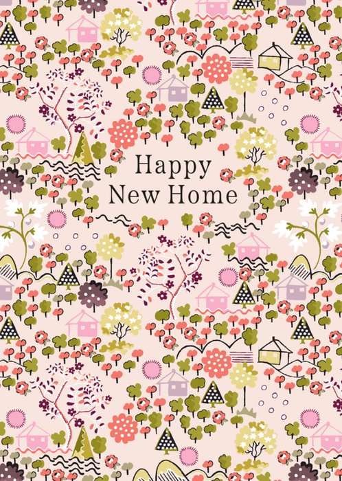 Featuring illustrations of tiny houses, trees and blooming flowers in soft greens, corals, pinks & lilacs, with black text in the centre of the card, all on a light beige background.