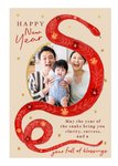 This greeting card design celebrates the Year of the Snake, featuring a red snake adorned with floral patterns wrapping around a circular photo upload area in the centre, with a gold frame accentuating the photo and gold decorative dots scattered throughout the beige background. The message combines elegant script and serif fonts, wishing clarity, success, and blessings for the new year.