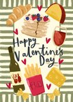 Featuring an illustration of a croissant, a glass of wine, a bottle of wine, fries, cheese, pasta and a meringue surrounding black script effect text & hearts. The card has a green and cream striped border around the edge and a brushed painted effect design and typography.