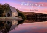 A photo of a small church reflecting onto a lake with a beautiful pink sky. Text reads 'Thinking of you' 'Siobhan', this can be personalised.