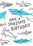 Featuring multiple illustrations of grinning sharks in blue, grey, black and white. In the centre is black text.