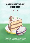 Front of card: Features an illustration of a cake and a rugby ball. Text reads: "Happy Birthday Freddie!" -this can be personalised! "Have a scrummy day!" -fixed text.