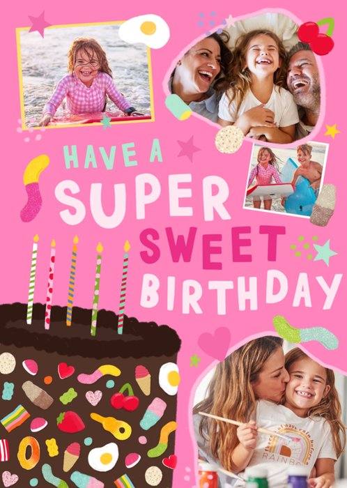 Featuring 4 photo upload frames & bold typography with colourful sweet shapes & stars, plus an iced birthday cake with candles on a pink coloured background.