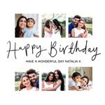Minimal stylish Birthday card with six photo upload areas, with handwritten text. Three of the frames are above the wording and three are below.