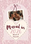 Anniversary card featuring a large central heart containing editable text, with a photo upload frame above. The heart and photo frame are sitting on a painterly heart and floral pattern background.