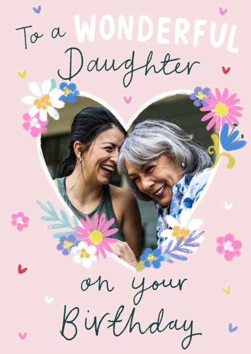 Front of card: Wonderful Daughter Photo Upload Birthday Card Heart photo frame surrounded by colourful flowers. Text reads: "To a wonderful daughter on your birthday".