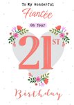 Front of card: Fiancée's 21st Birthday Card Heart shape decorated with flowers. Text reads: "To my wonderful fiancée on your 21st birthday". 'Fiancée' can be personalised!