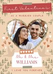 Front of card: First Valentine's Day Photo Upload Card Heart shape photo frame surrounded by hearts and foliage. Text reads: "First Valentine's as a married couple Mr & Mrs Williams I love you forever". 'Williams' can be personalised!