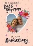 Front of card: Dad And Step Mum Photo Upload Anniversary Card Heart shaped photo frame decorated with flowers. Text reads: "To a wonderful dad & step mum on your anniversary".