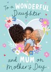 Front of card: Mother's Day Photo Upload Card Heart shaped photo frame surrounded by colourful flowers. Text reads: "To a wonderful daughter and mum on mother's day".