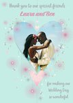Front of card: Wedding Day Photo Upload Thank You Card Heart shaped photo frame surrounded by sparkles. Text reads: "Thank you to our special friends Laura and Ben for making our wedding day so wonderful". 'Laura and Ben' can be personalised!