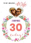 Front of card: Wife's Photo Upload Birthday Card Heart shaped photo frame with a circular flower arrangment around text. Text reads: "To my amazing Wife you're 30 today!". 'Wife' and '30' can be personalised!