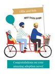 Front of card: Adoption card. Illustration of two male cyclists with a child onboard. Text reads: "Ollie and Rob best dad's ever! Congratulations on your amazing adoption news!". Editable names and text.