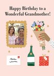 Front of card: Illustration of flowers, a present, a bottle of champagne and a letter with a photo upload image and text Text reads: "Happy birthday to a wonderful grandmother!".