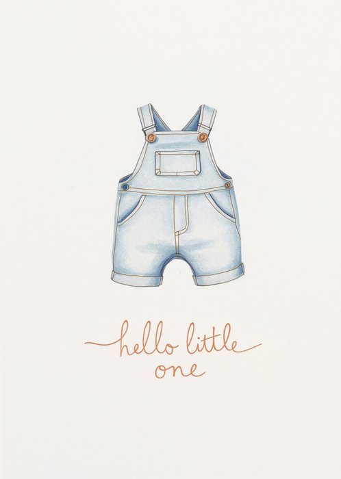 Minimalist design featuring a hand drawn illustration of baby denim dungarees on a plain white background,