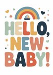 Bold multicoloured text with playful fonts reading “Hello, New Baby!” beneath a rainbow with a small sailboat in the arch, surrounded by scattered stars and hearts.
