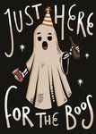 Featuring a cartoon ghost wearing a party hat and holding a bottle and a red cup, with playful typography above & below, all on a black background.