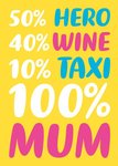 Text reads: "50% Hero, 40% wine, 10% taxi, 100% Mum".