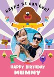 Front of card: Hey Duggee Happy As Can Be Photo Upload Mummy Birthday Card Features illustration of Hey Duggee appearing from behind circular photo upload in centre of card. Surrounded by Hey Duggee characters. Text reads:"Happy As Can Bee! Happy Birthday Mummy". Mummy can be customised.