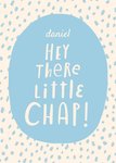 Front of card: Large blue oval shape with cream typographic hey there little chap text surrounded by light blue polka dots on a cream background, with editable name space at the top. Text reads:"Daniel. Hey there little chap!.” With customisable name.