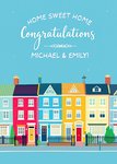 Front of card: A modern design featuring a row of colourful houses against a blue background scattered with tiny stars. The design has white text at the top with a decorative flourish and editable names.
