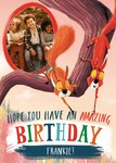 Front of card: Featuring a sweet illustration of two young squirrels hanging from a tree reaching downwards the main handwritten text. There is one photo upload area inside an oval frame. Text reads: "Hope you have an amazing Birthday, Frankie!