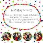 "Birthday wishes may your birthday hopes and dreams, and wishes all come true, there's no-one who deserves them more, than someone just like you".