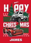 Featuring a festive illustration with Hot Wheels vehicles and Christmas trees.
