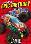 The greeting card features two large, colourful monster trucks racing through a dynamic scene with debris flying around. The trucks are set against a vibrant red background, with the bold text “Have an Epic Birthday” in yellow and white at the top. The name “Jamie” is personalised in white at the bottom.