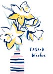 A beautifully illustrated Easter card featuring bold yellow daffodils in a striped vase with hand-lettered text.
