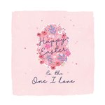 A sweet and sentimental Easter card featuring a handwritten-style script for the main text. In the centre, there is a hand-painted Easter egg with flowers inside, all on a pink watercolour square in the background.