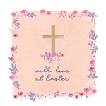 Front of card: A sweet and sentimental Easter card featuring a handwritten-style script for the main text. There is a gold religious cross in the centre with flowers around the border of a salmon-pink watercolour square in the background.