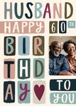 A colourful, modern birthday card featuring hand lettered text arranged in painterly blocks with the addition of a rectangular photo frame. The design has a cream background.