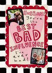 Featuring a hand lettered message over a large pink heart, with two photo frames and a red scalloped border with small heart doodles, on a cream background. Around the edge of the card is a black and white, chequered frame.
