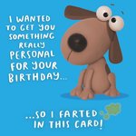 Features an illustration of a dog. Text reads "I wanted to get you something really personal for your birthday... so I farted in this card!".