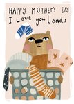 A charming illustrated Mother’s Day card featuring a cute bear surrounded by laundry baskets full of clothes and socks.