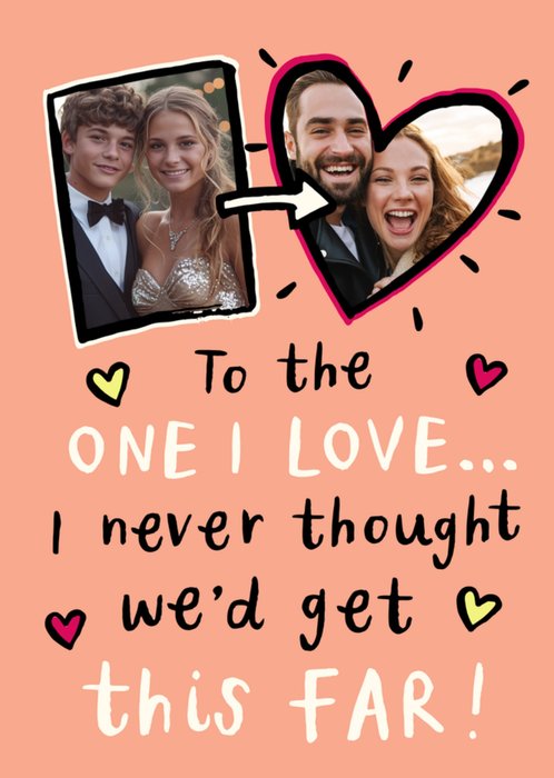 This playful and romantic greeting card features two photo upload areas: a rectangular frame on the left and a heart-shaped frame on the right, connected by a white arrow. The text below reads, “To the one I love… I never thought we’d get this far!” on a peach-coloured background, decorated with small yellow and red hearts.