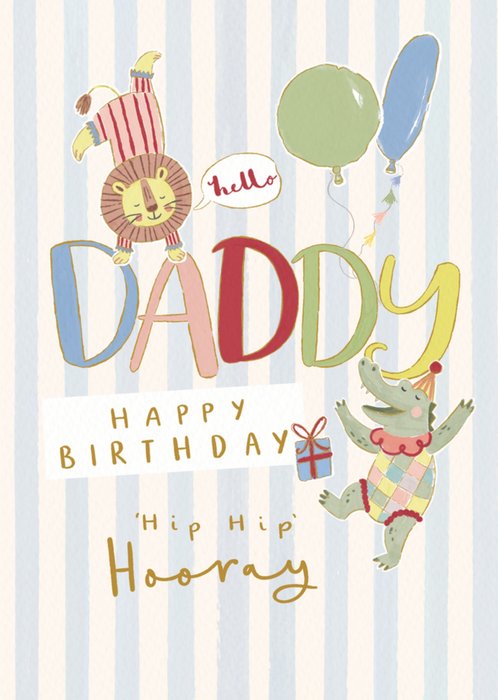 Featuring a lion in striped clothes, a dancing crocodile, balloons and a present on a blue and white striped background.