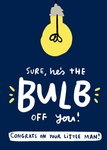 The card reads: "Sure, he's the bulb off you! Congrats on your little Man!".