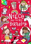 Features multiple cute illustrations of female characters arranged around the edge of the card doing different activities such as painting, riding a scooter and drinking a slushy. Amongst the characters are also other illustrations of a cat, dog, unicorn, cake, popcorn, kite and butterfly on a red background. In the centre of the card is white text.