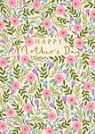 Featuring gold-effect lettering surrounded by an illustrated floral pattern with pink flowers, purple buds, green leaves and small blue berries on a cream background.